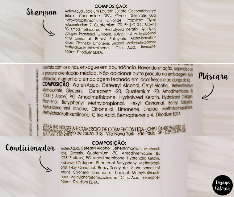Como vocês podem ver acima, os produtos da linha Desmaia Cabelo são livres de parabenos, petrolatos, corantes e também não possuem sal (o que é ótimo para quem é adepta da escova progressiva, pois ajuda a manter o efeito liso!).